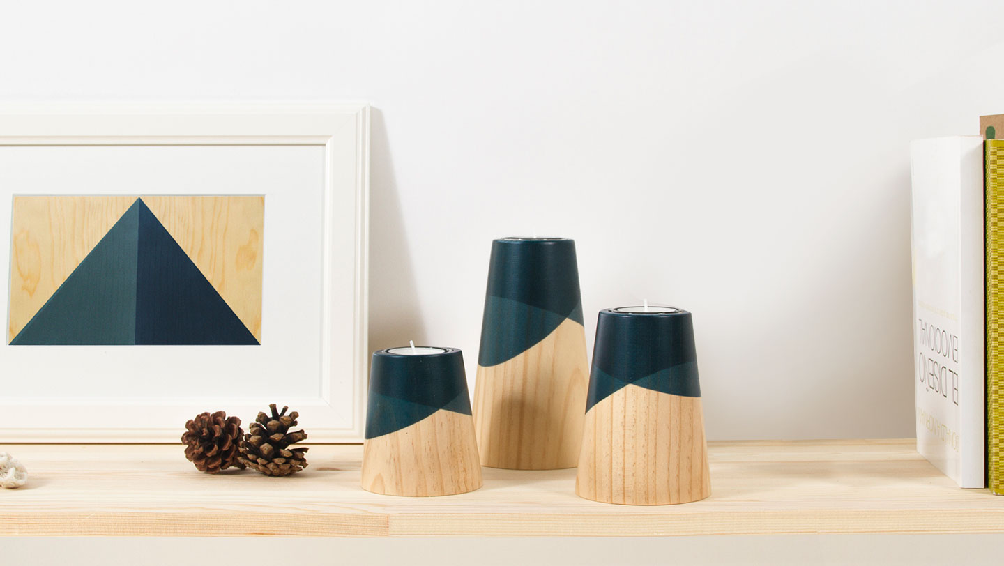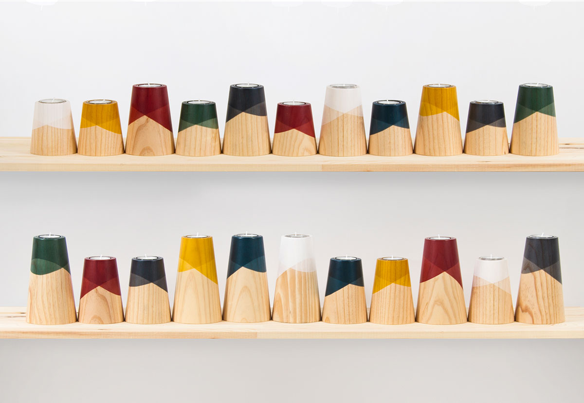 Etna Mini is a collection of candle holders, ideal to give any environment a splash of light and colour. Its simple and clean lines come from a conical shape made of solid pine wood. At the top are curves which evoke lava flows gliding down the slope of a volcano. This colour highlights the natural shades in the wood thanks to its translucency.