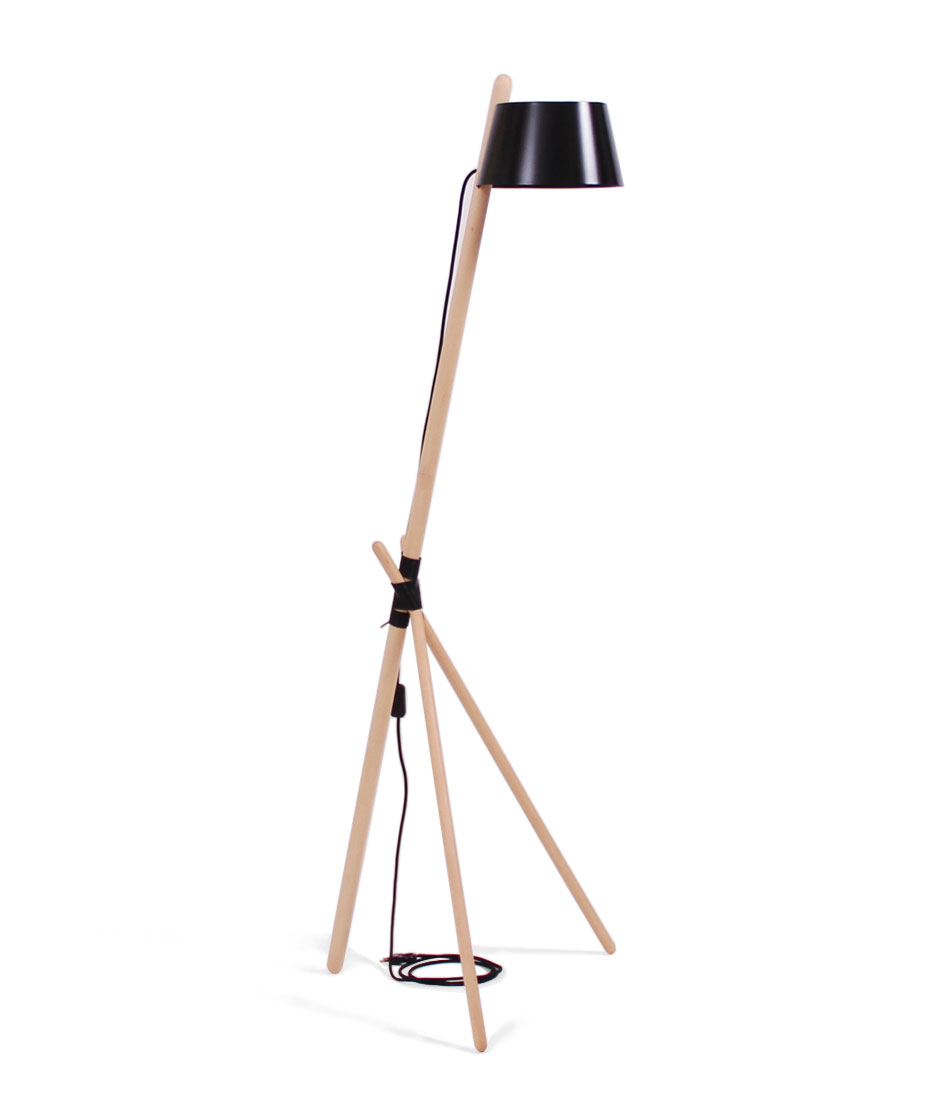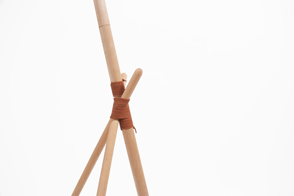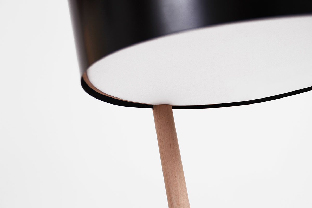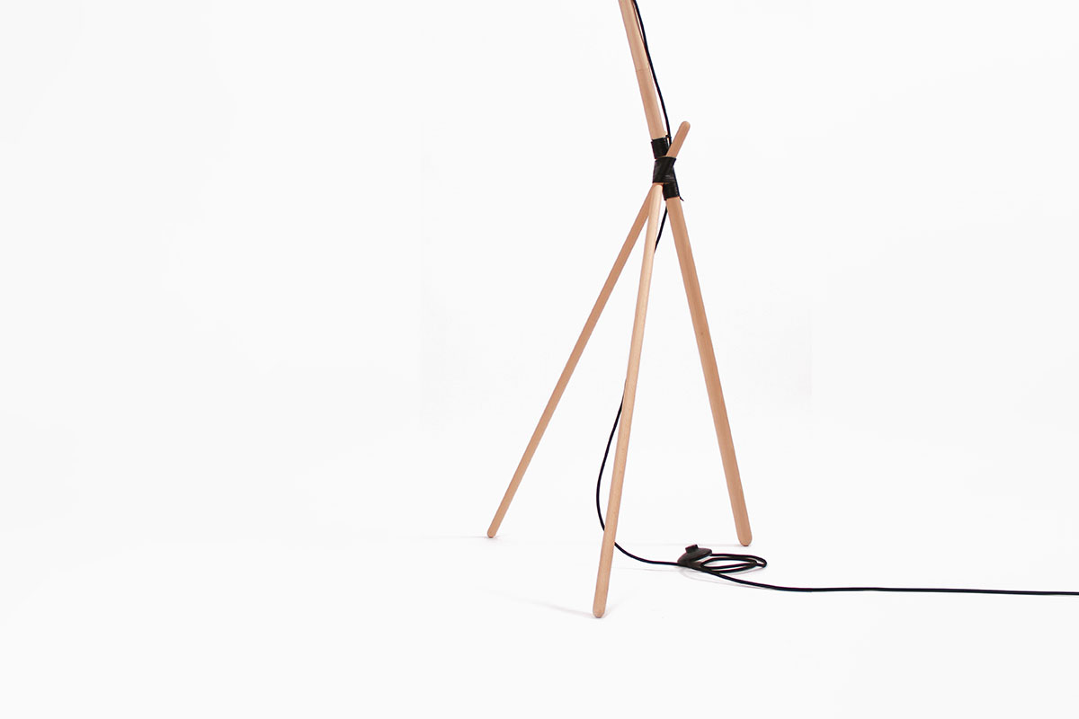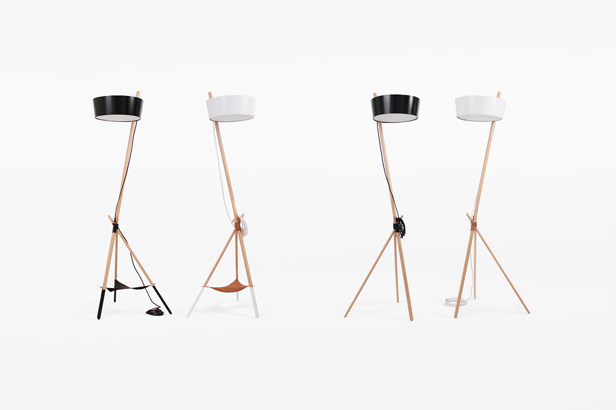 Ka XL is a standard lamp, which radiates ambient light. Its simple and elegant lines are drawn from a stylish structure of beech wood slats, a tripod shape and joined together by a leather thread. At the top of the pole is a large metal lampshade which filters the light through a natural cotton diffuser.