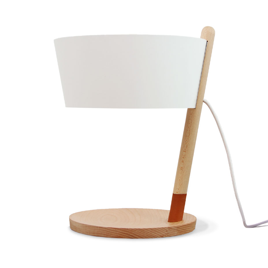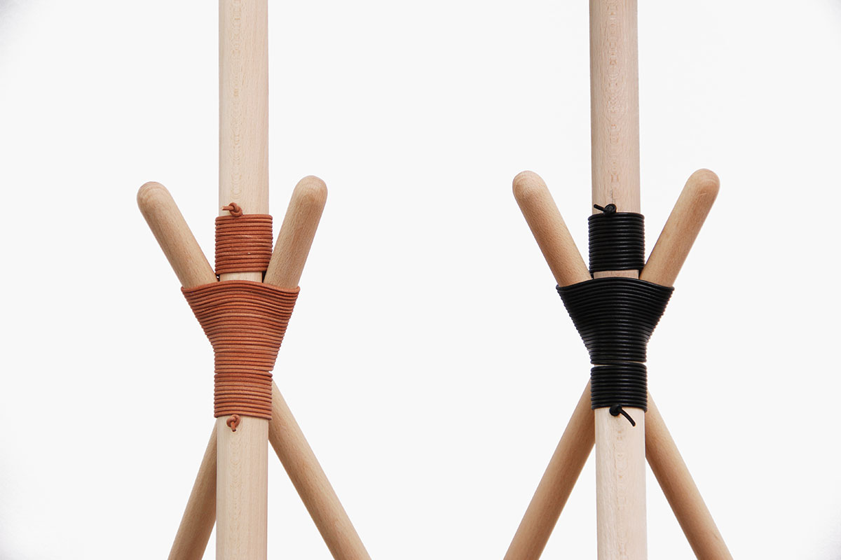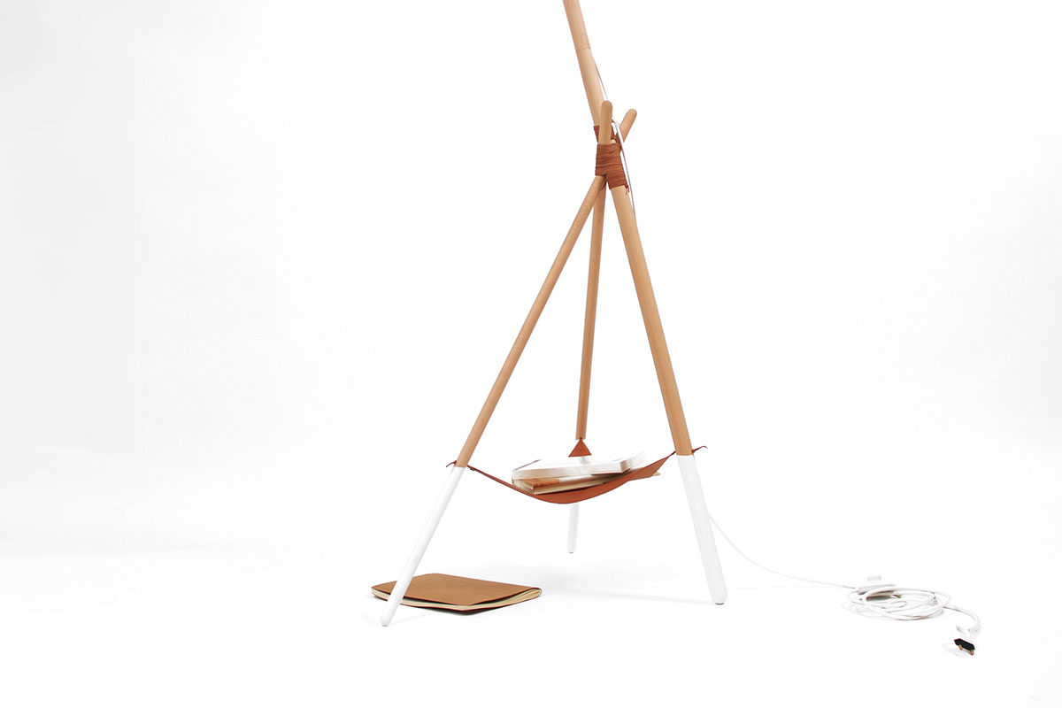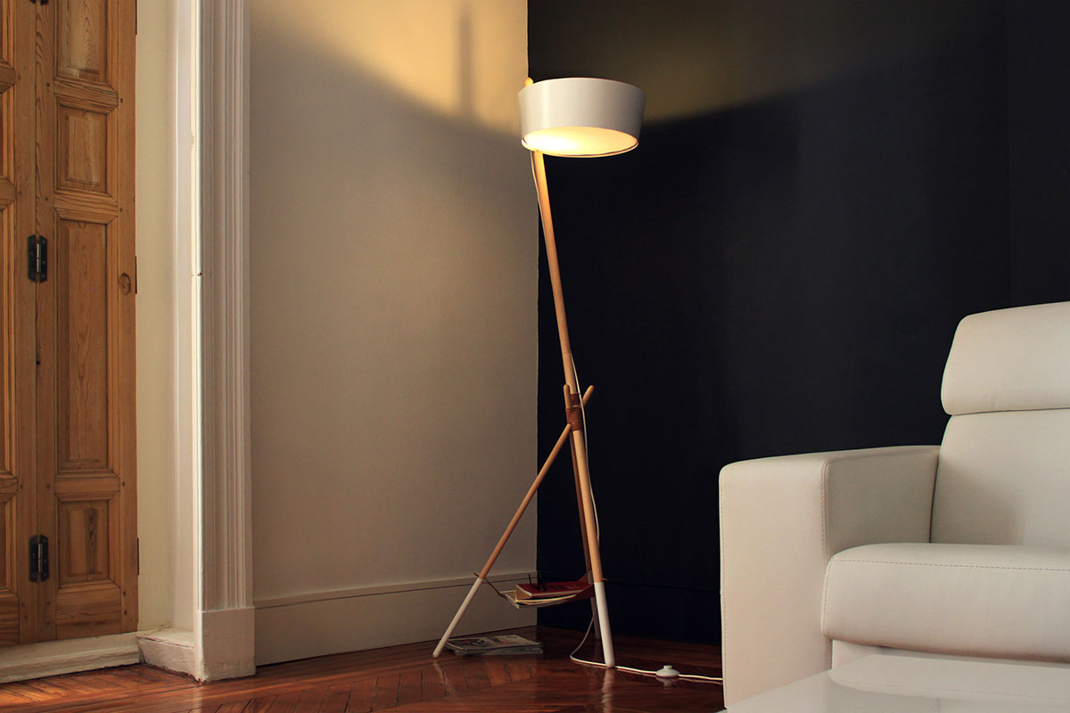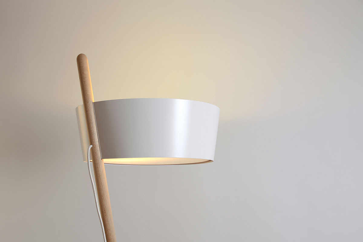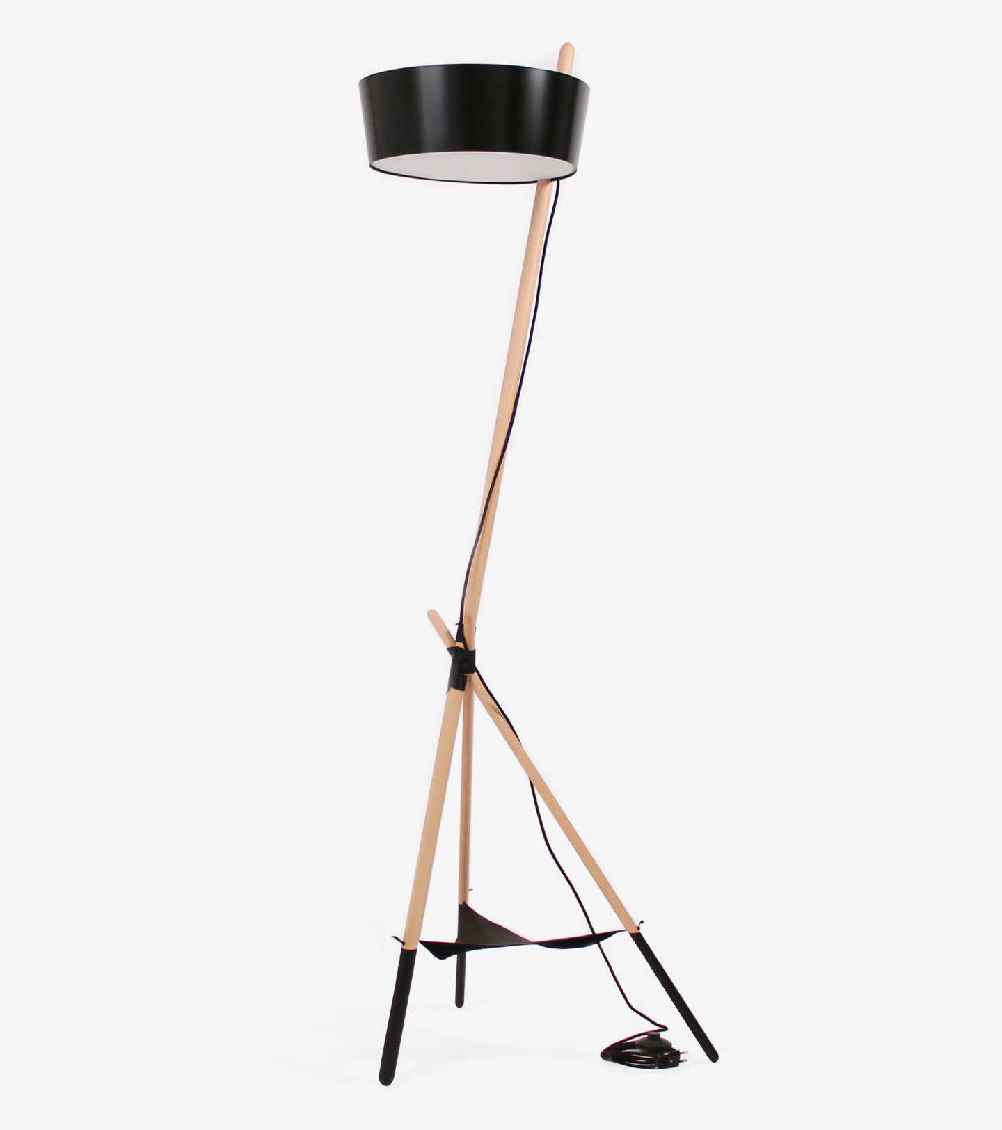 Ka XL is a standard lamp, which radiates ambient light. Its simple and elegant lines are drawn from a stylish structure of beech wood slats, a tripod shape and joined together by a leather thread. At the top of the pole is a large metal lampshade which filters the light through a natural cotton diffuser.